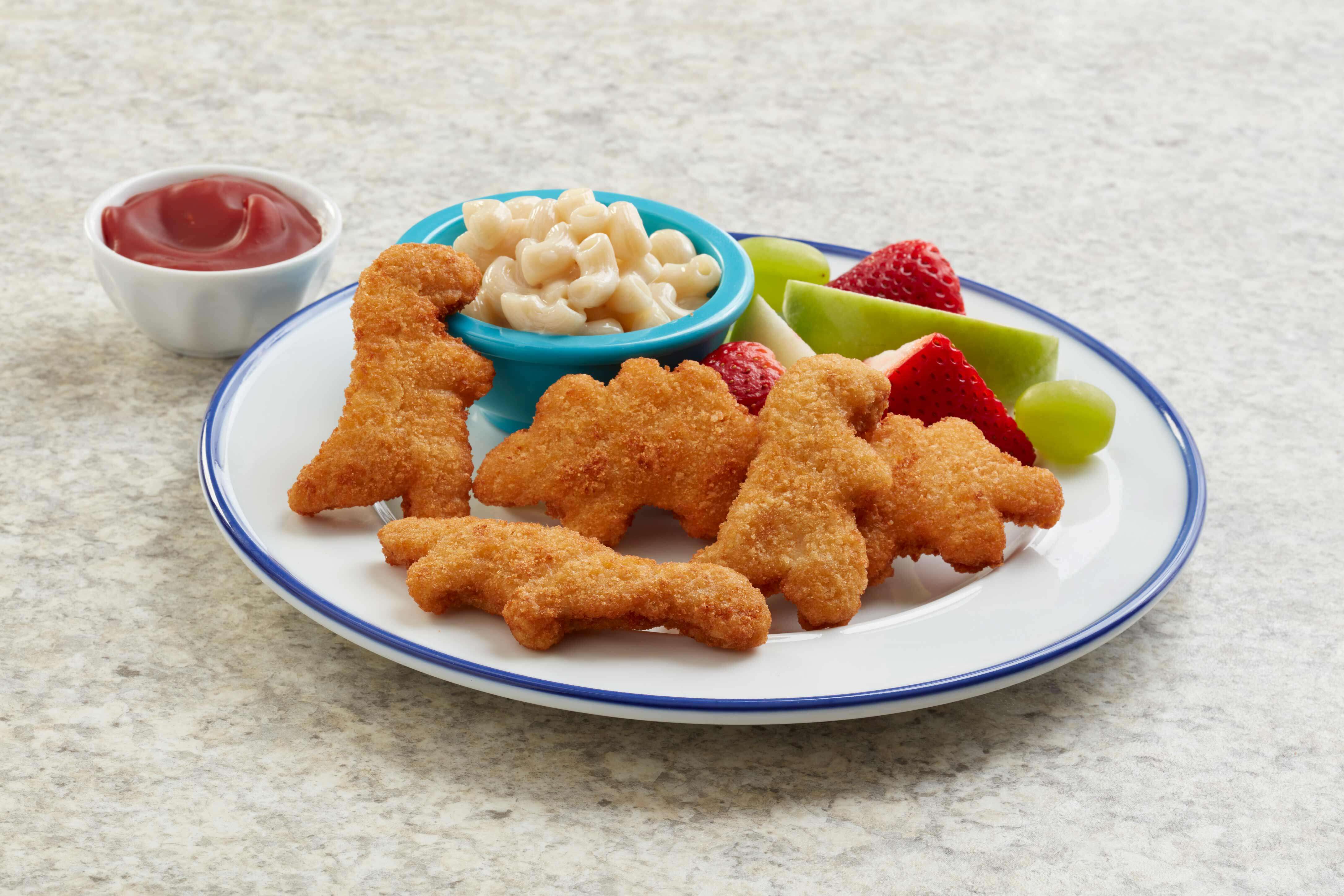 For example with 5 nuggets meatless becomes 1125g total fat very close to chickens 11g. Vegetarian reveals she drunk emailed Quorn demanding a meat-free alternative to dinosaur-shaped chicken nuggets in hilarious tweet and the firm promised to consider it. Made with a blend of white meat chicken breast chickpeas and cauliflower and shaped into dinosaurs for a nutritious kid-approved meal.